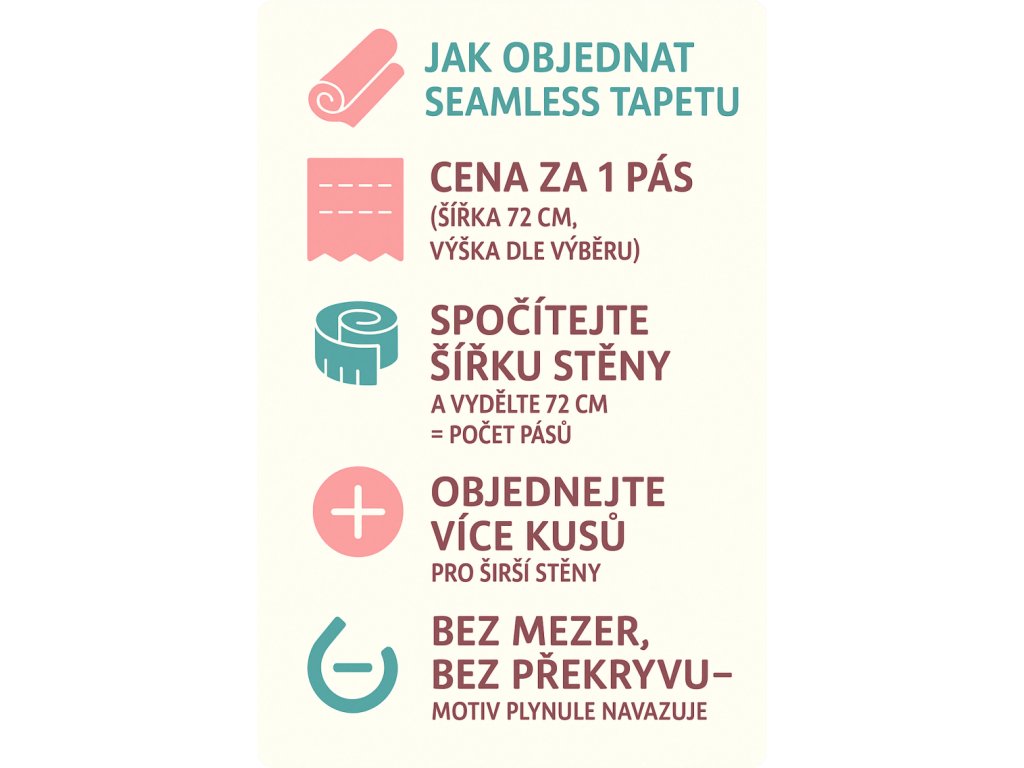 ✅ Pásy se lepí vedle sebe beze spár a překryvu, motiv na sebe přesně navazuje, takže výsledný vzhled je jednolitý a plynulý.